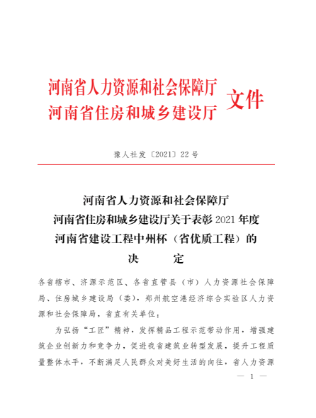 据悉,“中州杯”奖是河南省建设行业工程质量的最高荣誉奖项,本次评选范围为河南省行政区域内2017年6月30日—2020年6月30日期间完成竣工备案,并经过一年以上使用没有发现质量缺陷和质量隐患的新(扩)建工程。“中州杯”由河南省住房和城乡建设厅组织评选,每年评选一次。